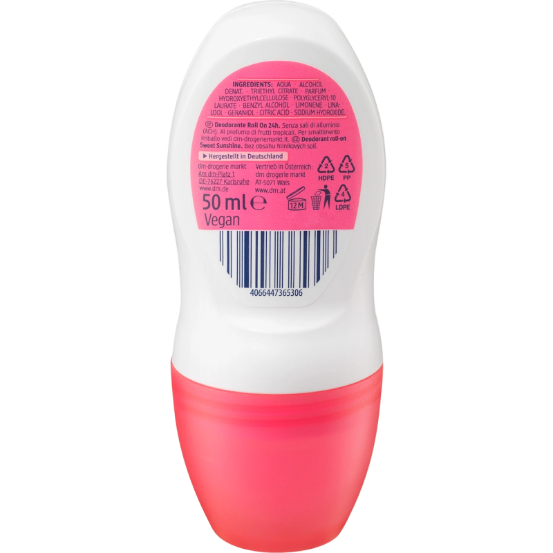 Das Deodorant Roll-On Sweet Sunshine von Balea verzaubert die Sinne mit einem fruchtigen Duft nach tropischen Früchten. Das effektive Deo wirkt bis zu 24 Stunden lang und sorgt so für extra Sicherheit. Dabei kommt die Formulierung ganz ohne Aluminium aus. Rezeptur ohne Mikroplastik und wasserlösliche rein synthetische Polymere.