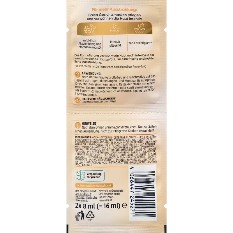 Wohltuende Auszeit für gestresste Haut: Die Balea Milch & Honig Maske mit Macadamianussöl spendet der Haut sofort und lang anhaltend Feuchtigkeit.* Sie wirkt so intensiv pflegend und hinterlässt ein samtig-weiches Hautgefühl. Die Formulierung mit Milch und Akazienhonig verwöhnt die Haut zudem und pflegt sie zart und geschmeidig. Müde, gestresste Haut erlangt ihre natürliche, frische Ausstrahlung zurück. Rezeptur ohne Mikroplastik und wasserlösliche synthetische Polymere. *In-vivo-Studie mit 20 Tester:innen nach einmaliger Anwendung.